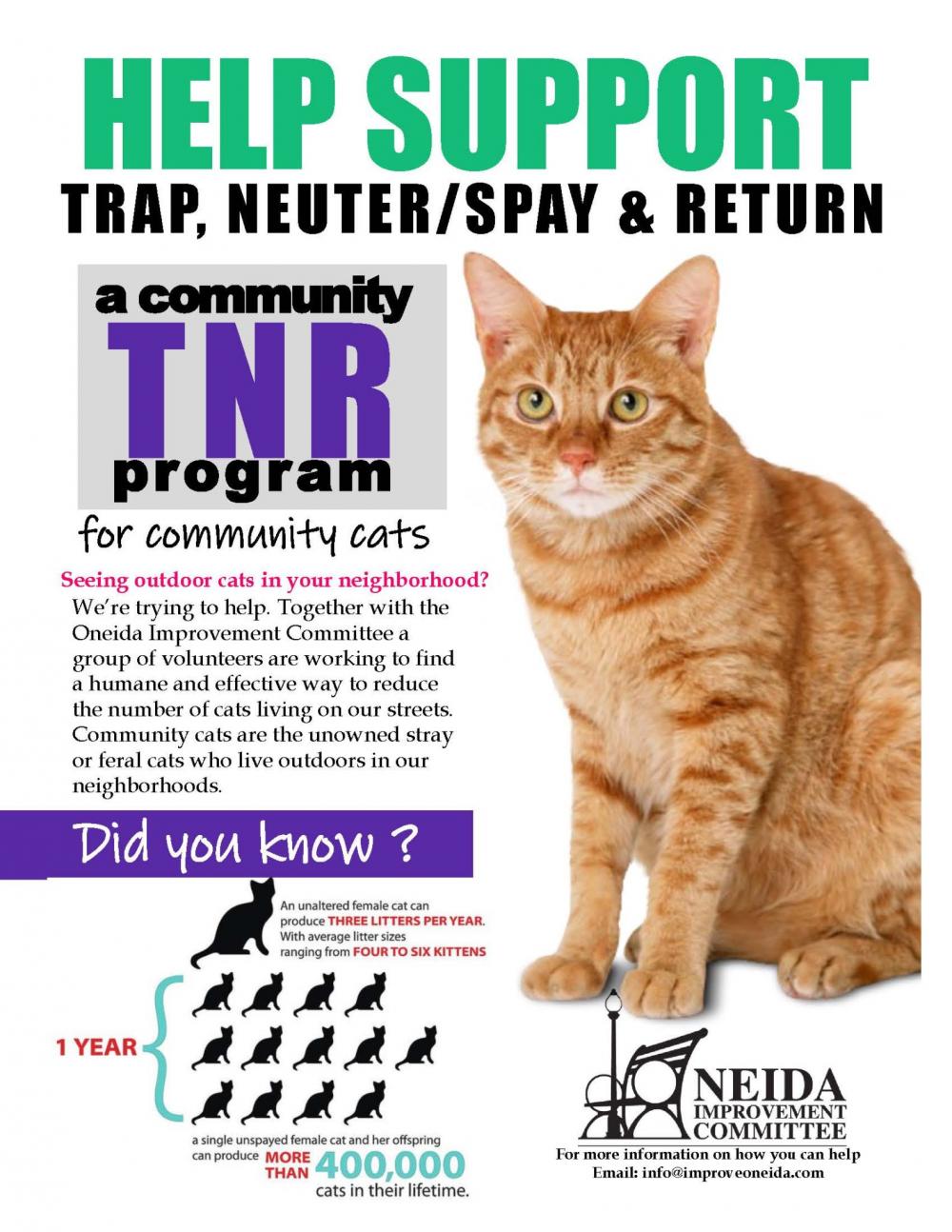 "The mission of the Oneida Community Cats Committee is to work with compassionate individuals, our local government and other volunteers/community members to achieve population decline of the unaltered, free-roaming, feral, and/or abandoned domestic cats in our area through education and the use of a Trap/Neuter/Return (TNR) program."